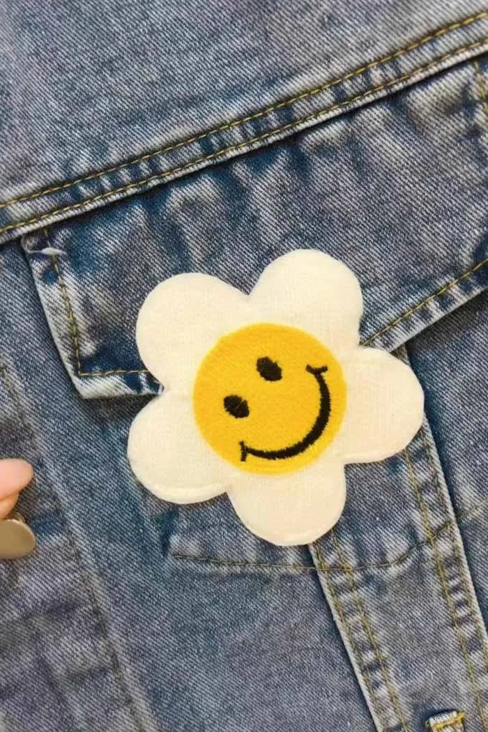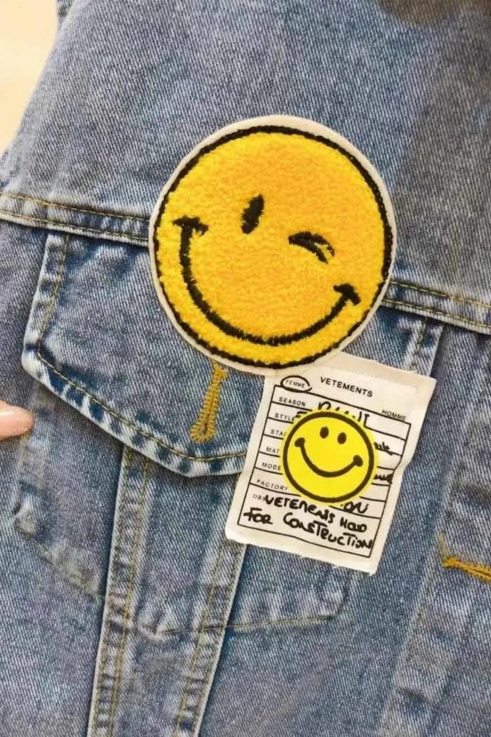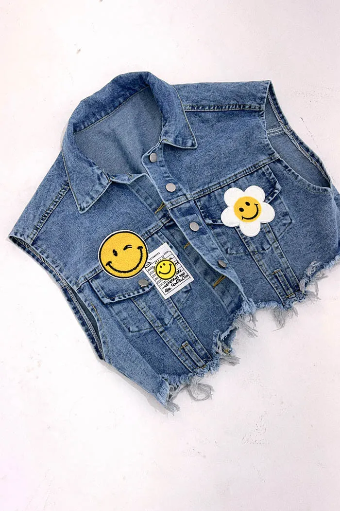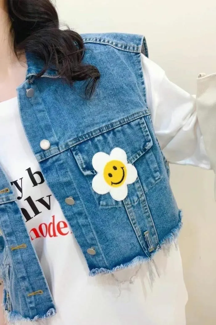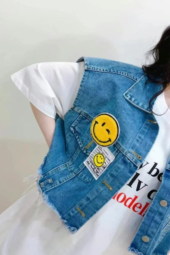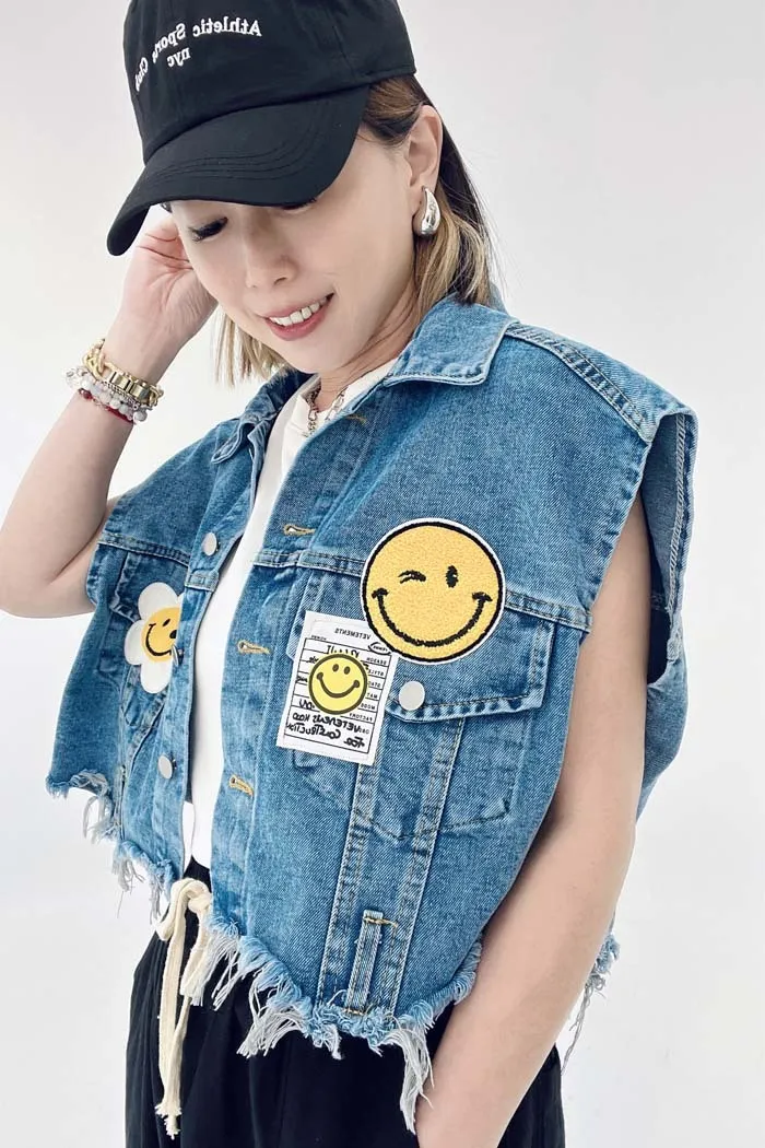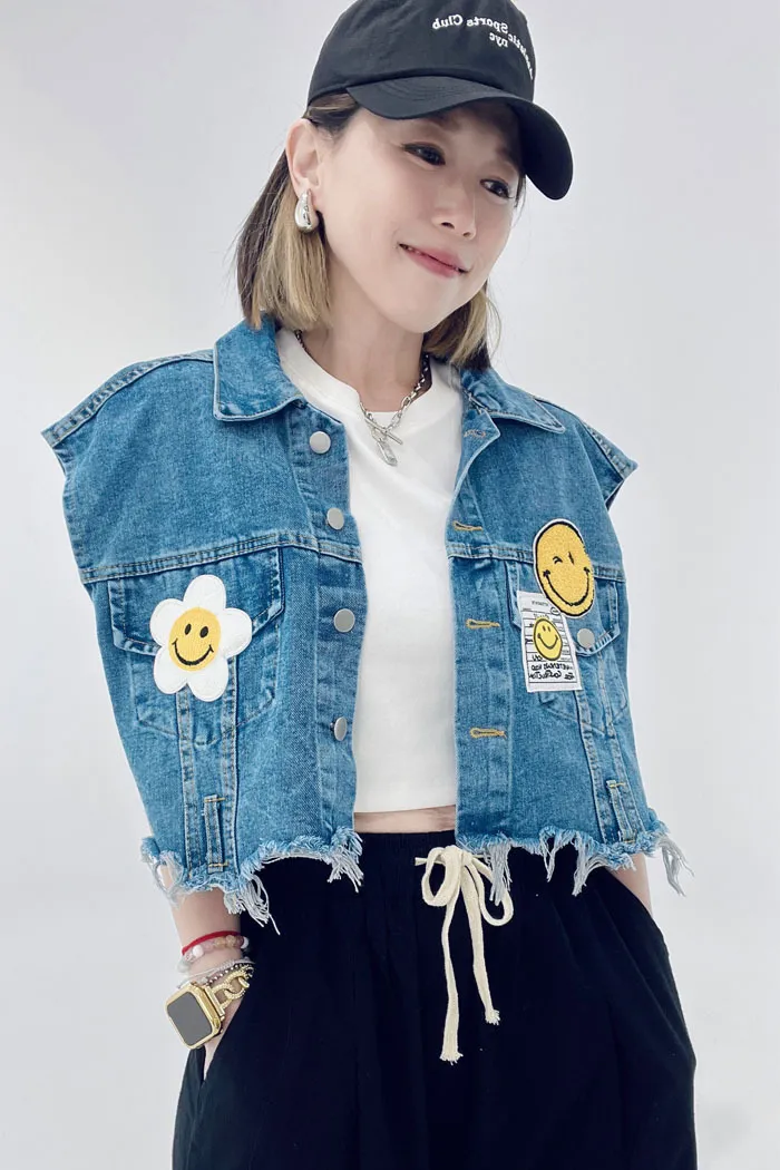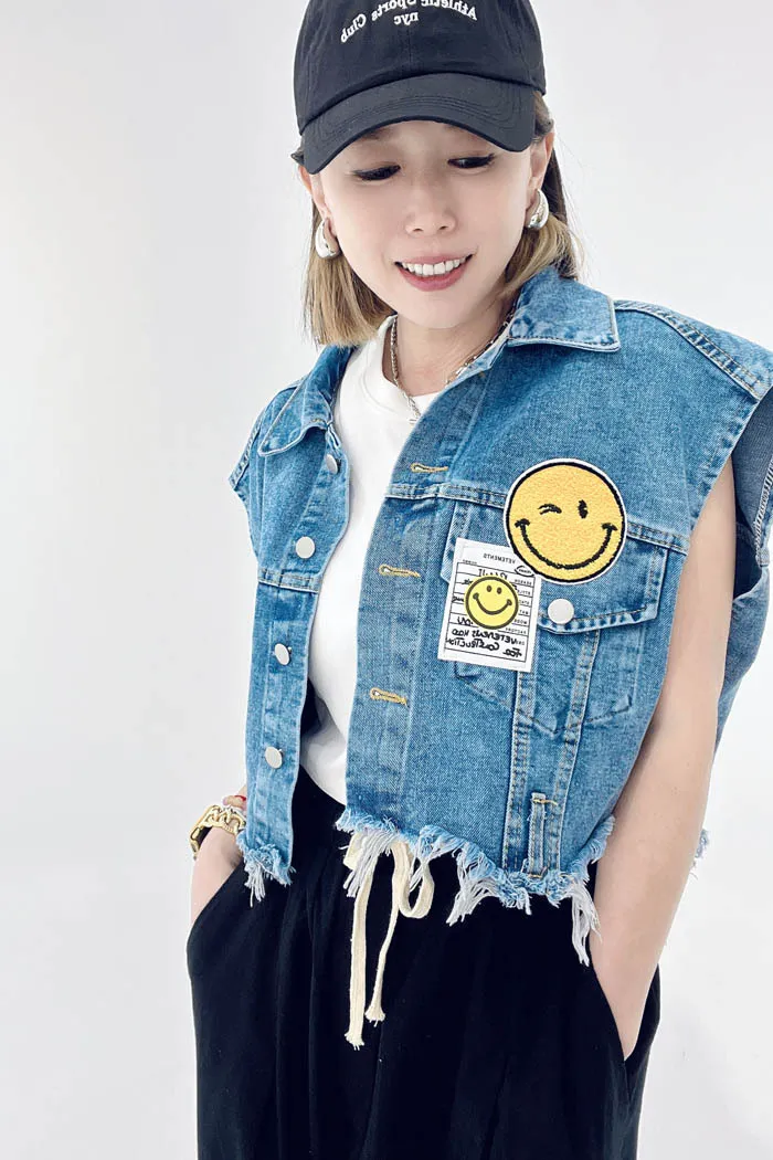 日系笑臉貼布水洗H版不規則下擺丹寧背心
