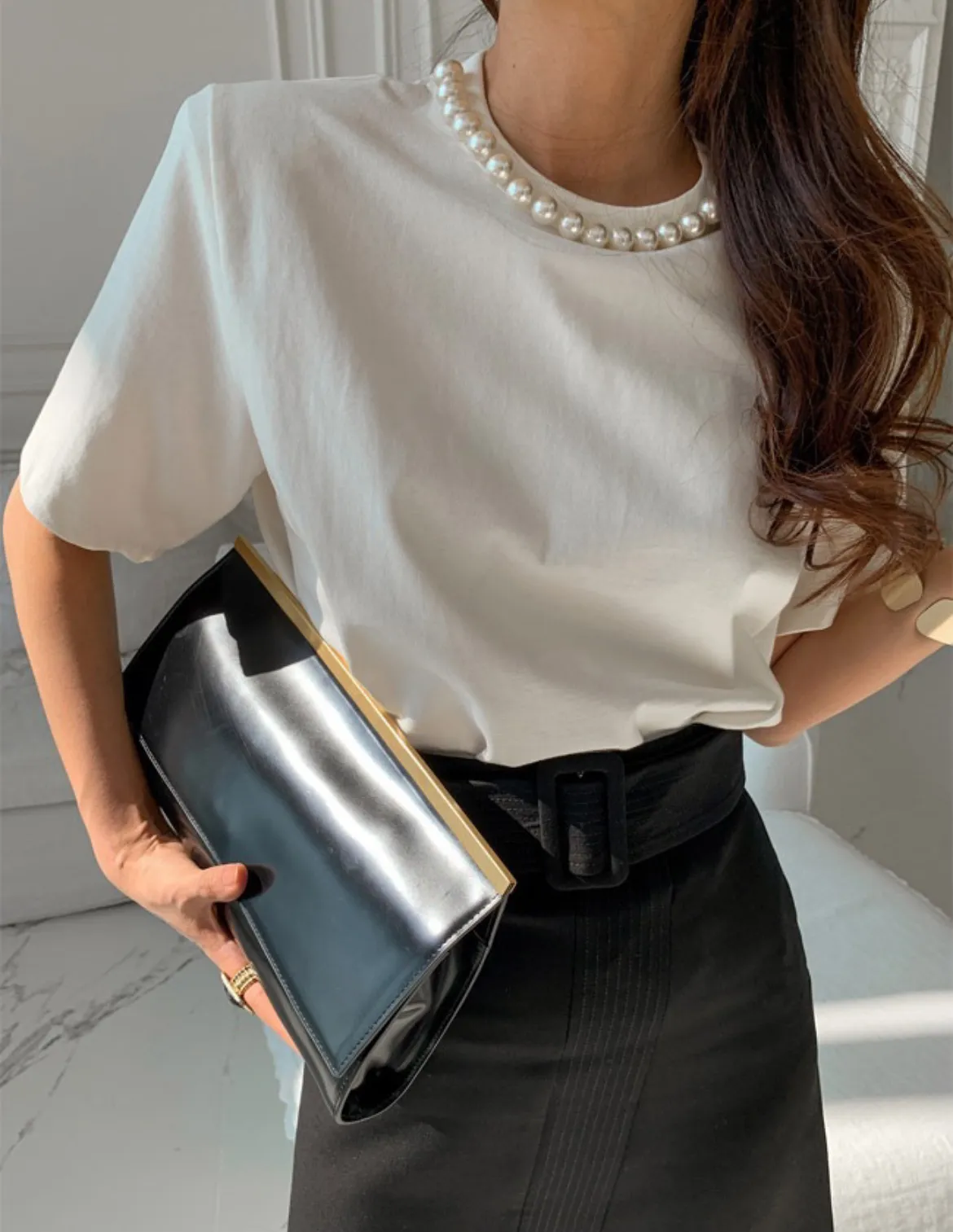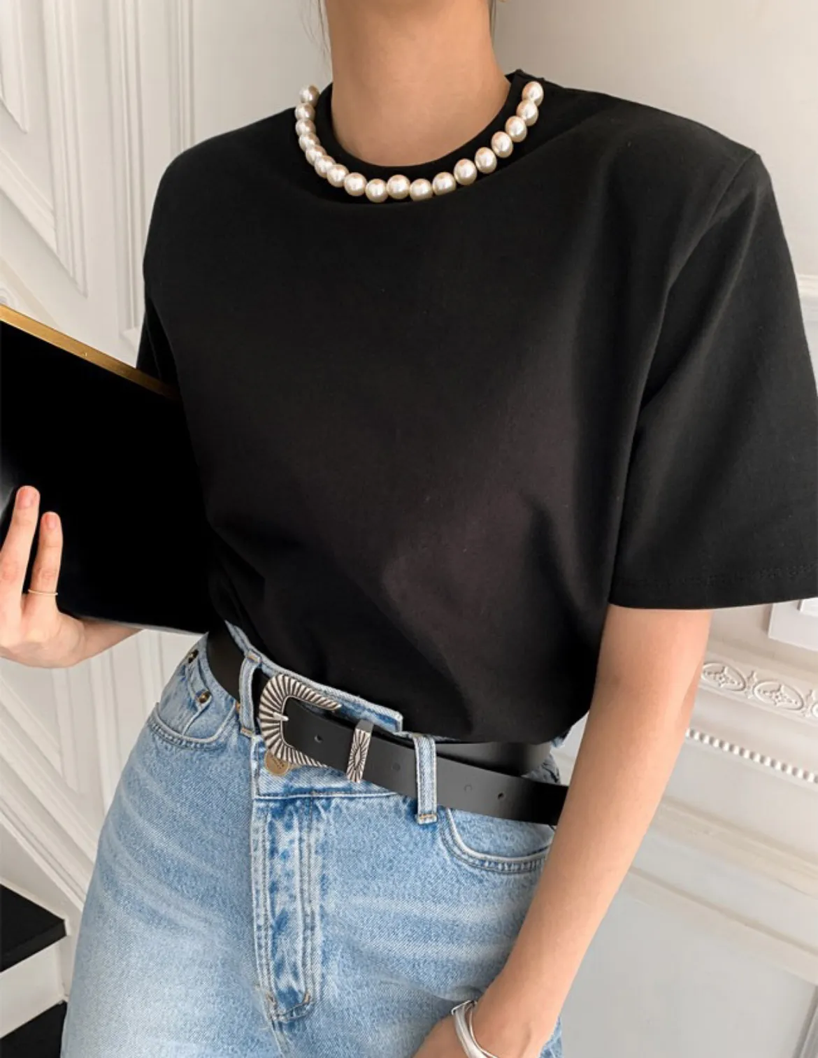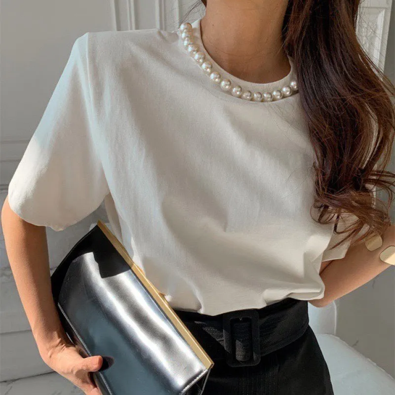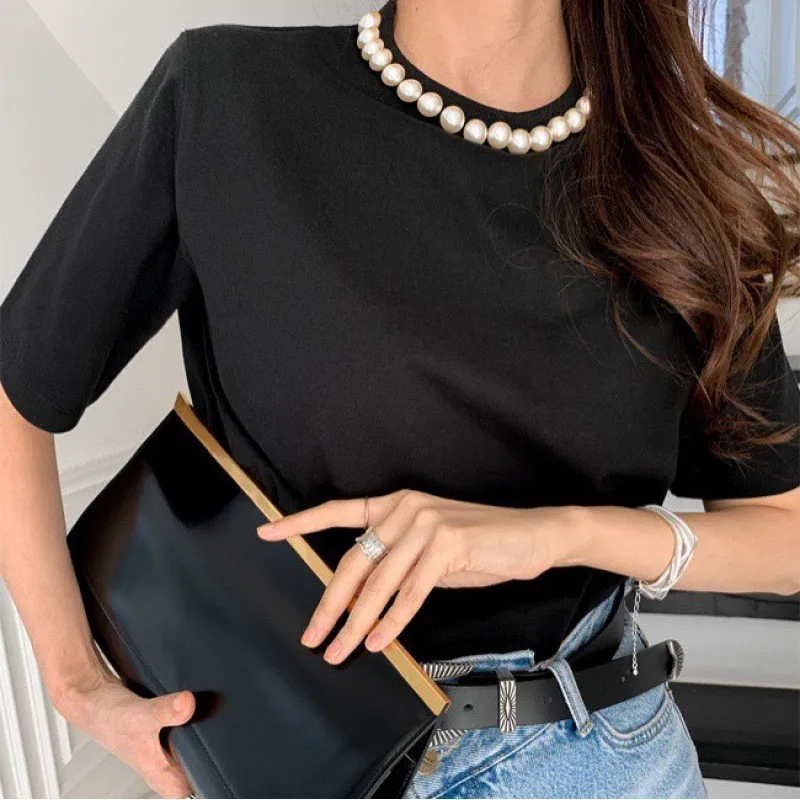 9月新品預購-珍珠領裝飾厚棉大彈力短袖