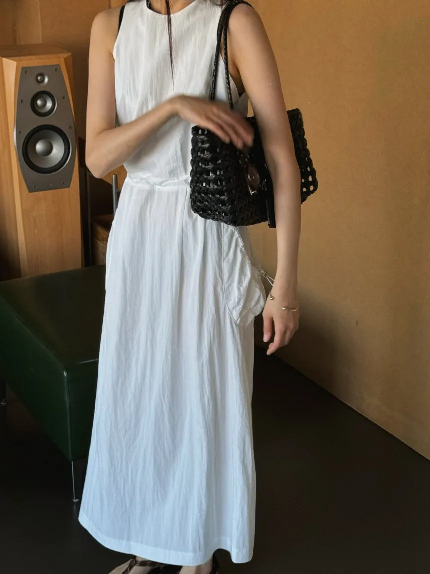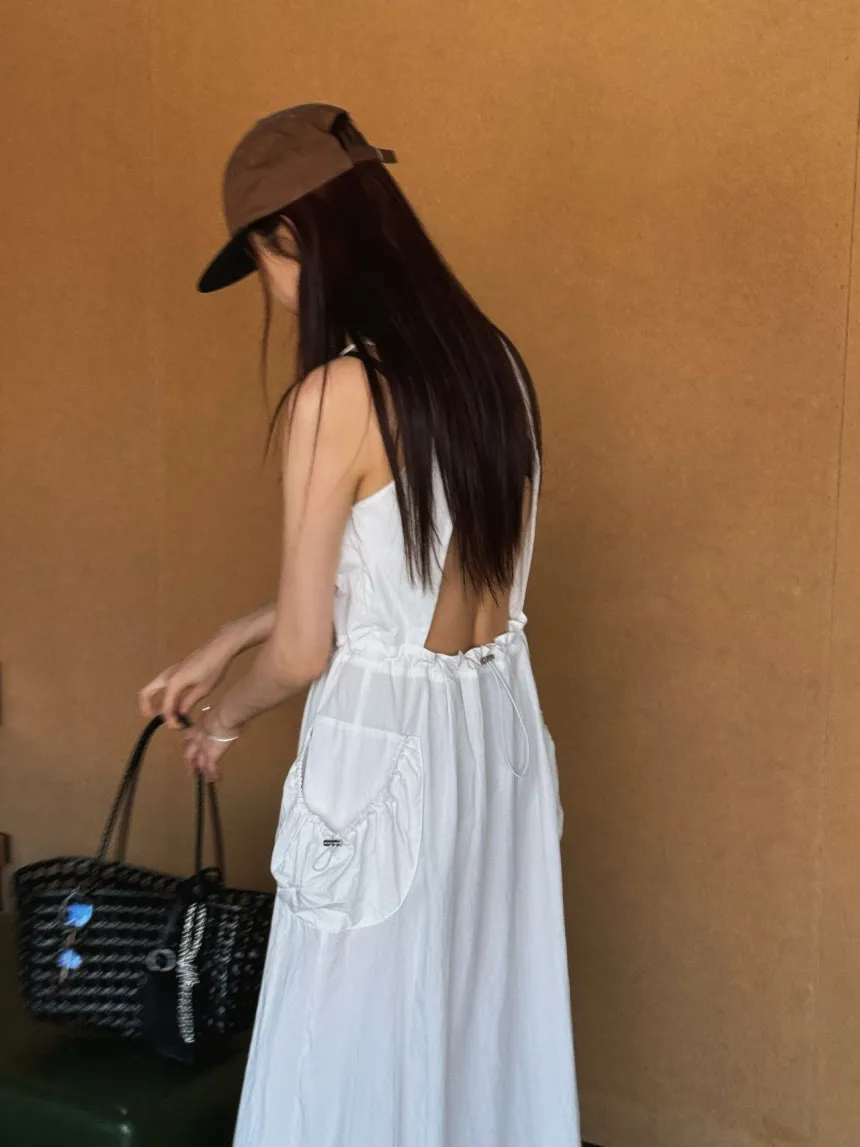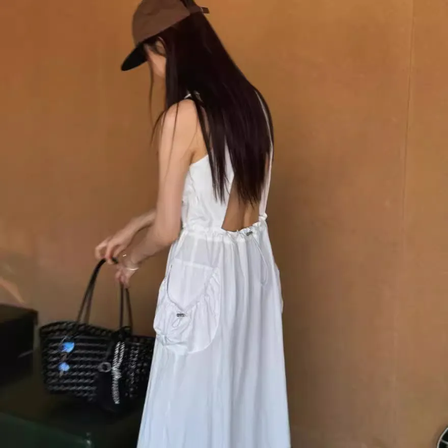 韓國chic夏日復古小眾設計款小性感露背大口袋背心裙