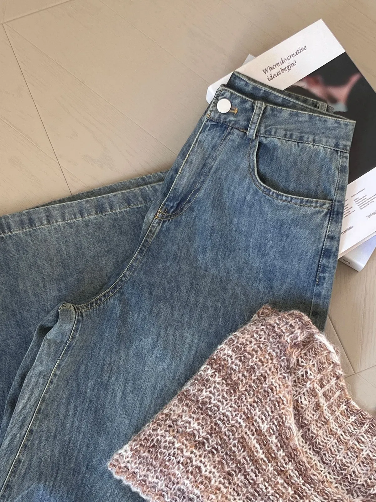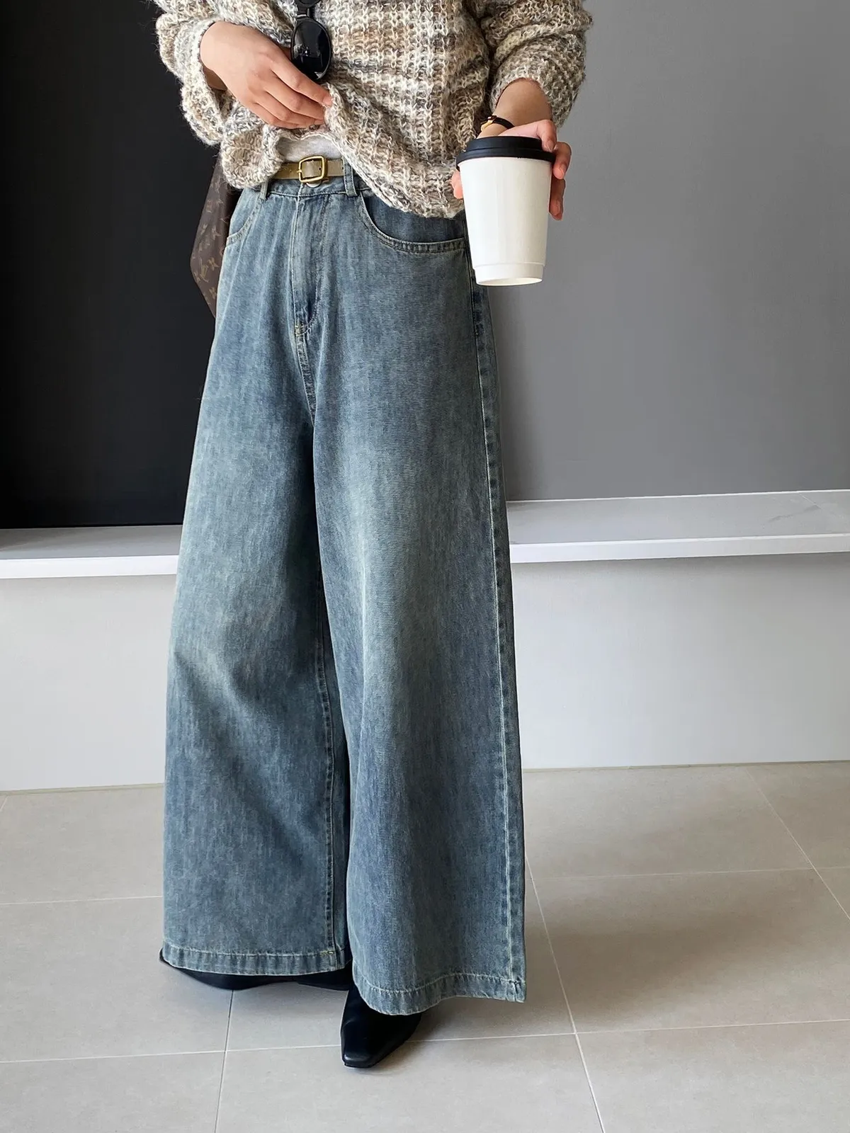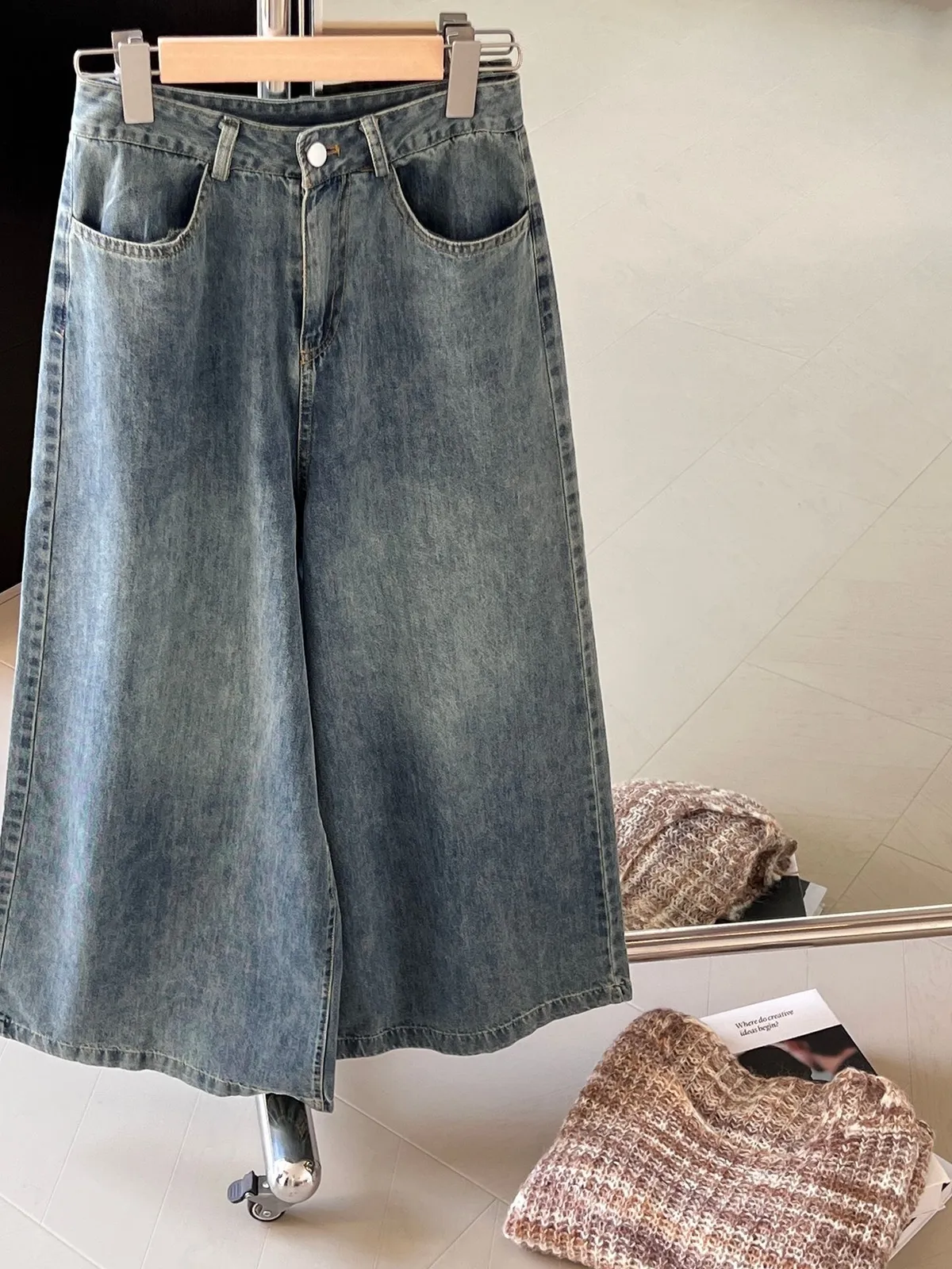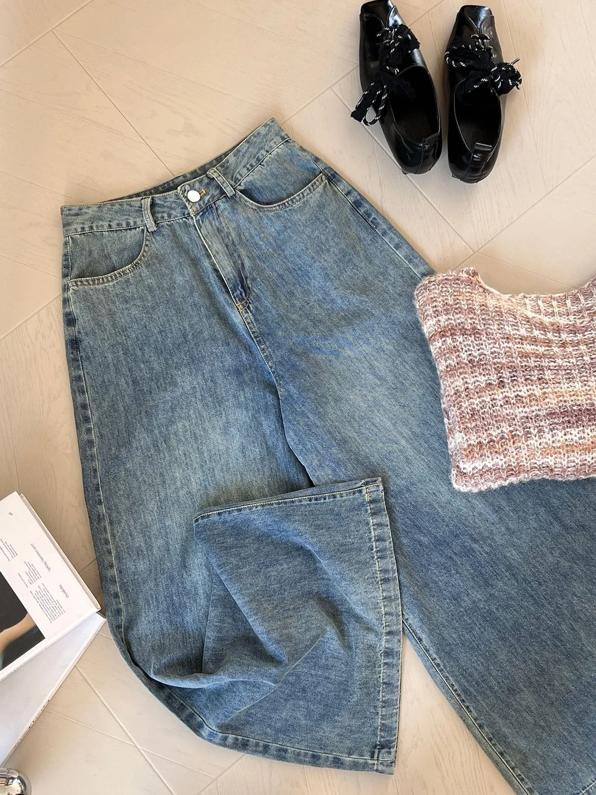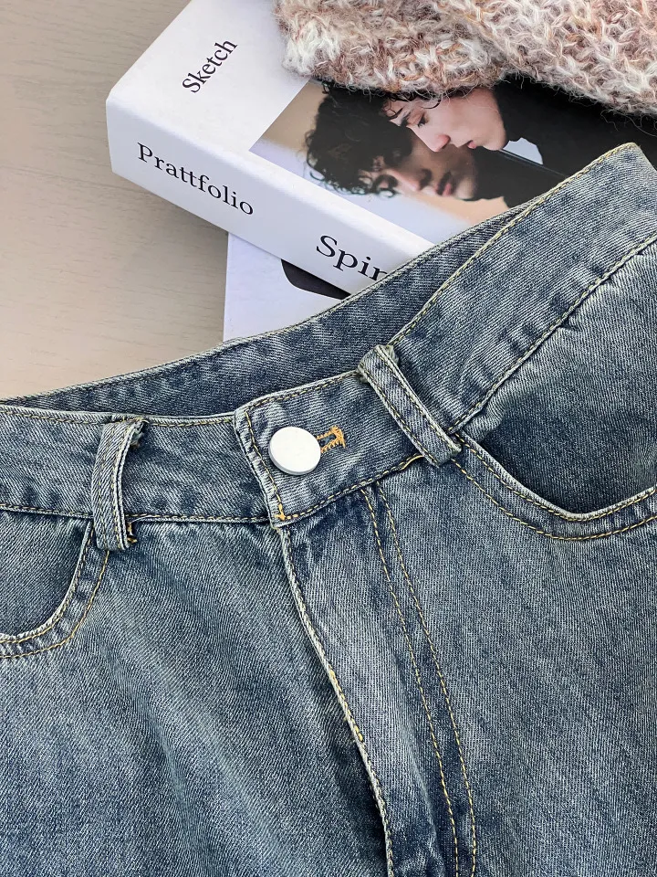 這款 韓版復古高腰闊腿牛仔褲,是衣櫃必備的百搭單品,