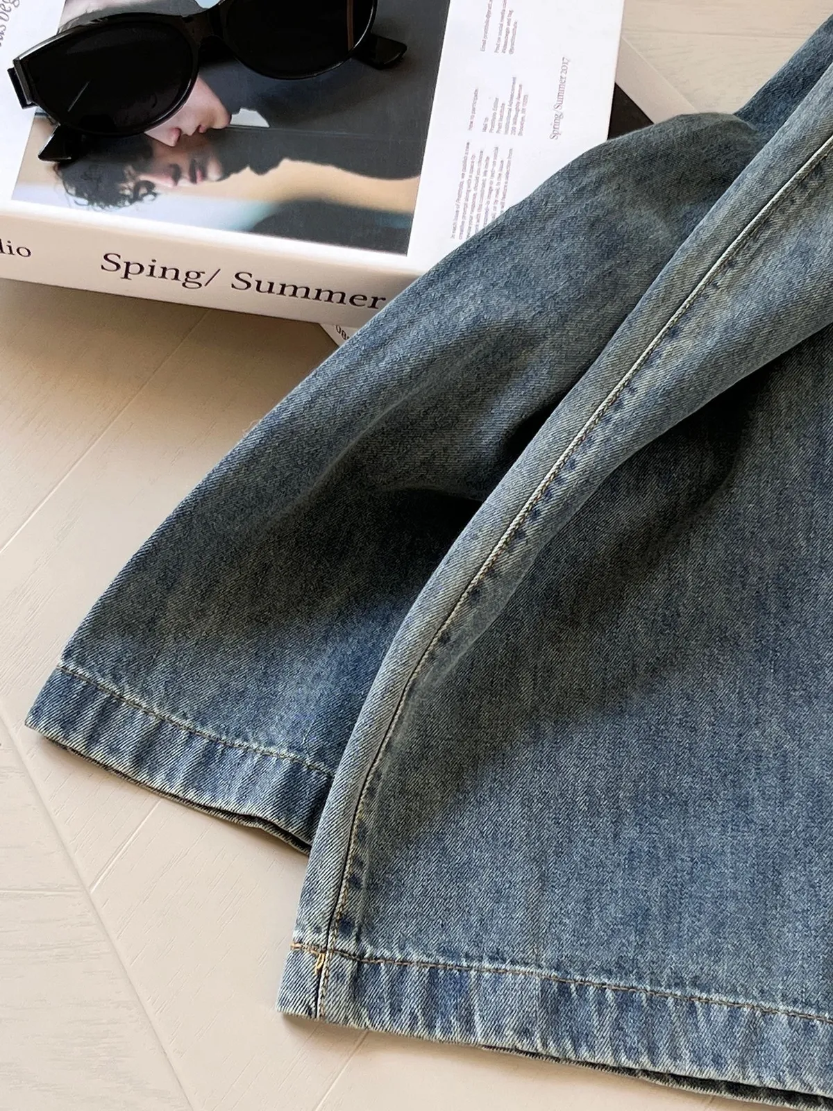✔ 復古水洗牛仔布料,呈現自然刷色,增添時尚感。