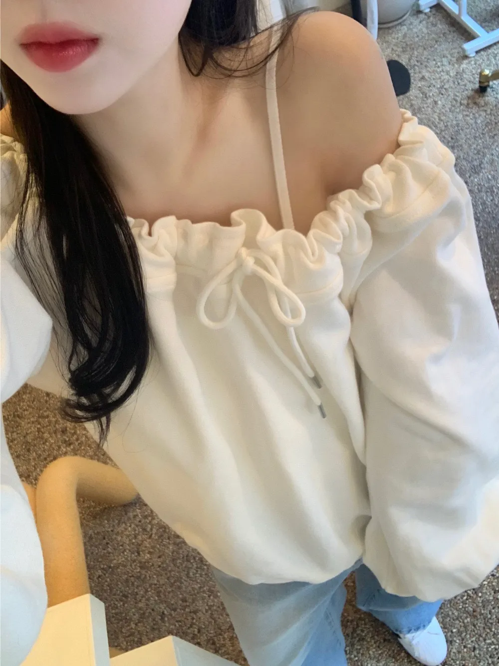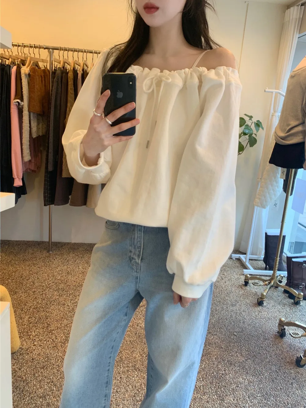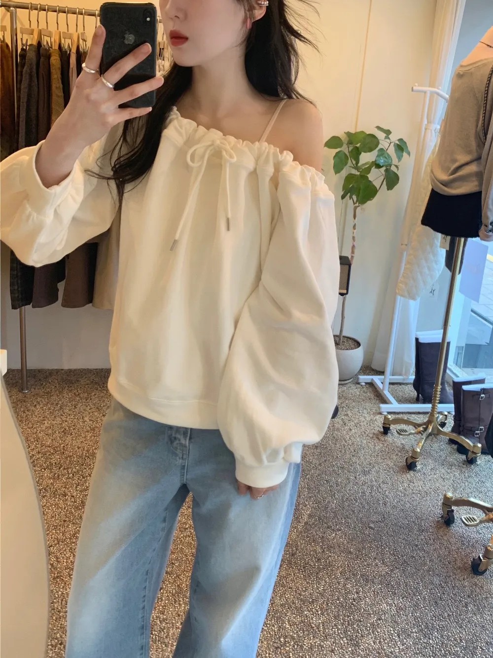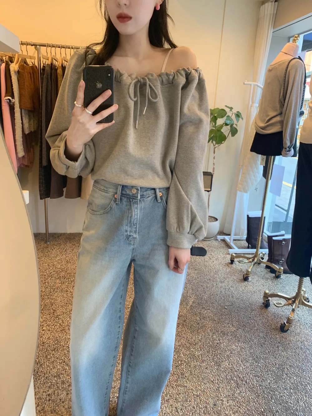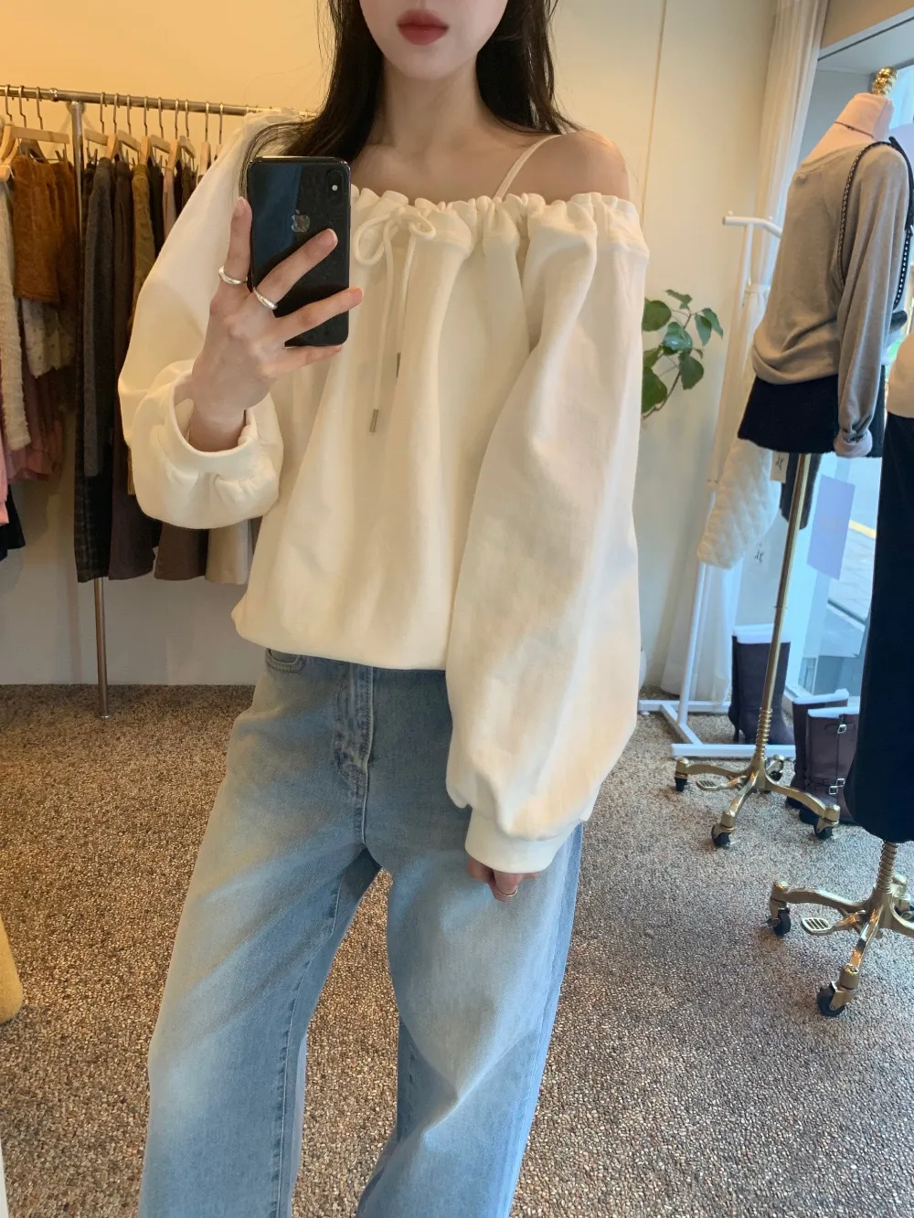 法式一字肩性感露肩抽繩簡約休閒顯瘦上衣
