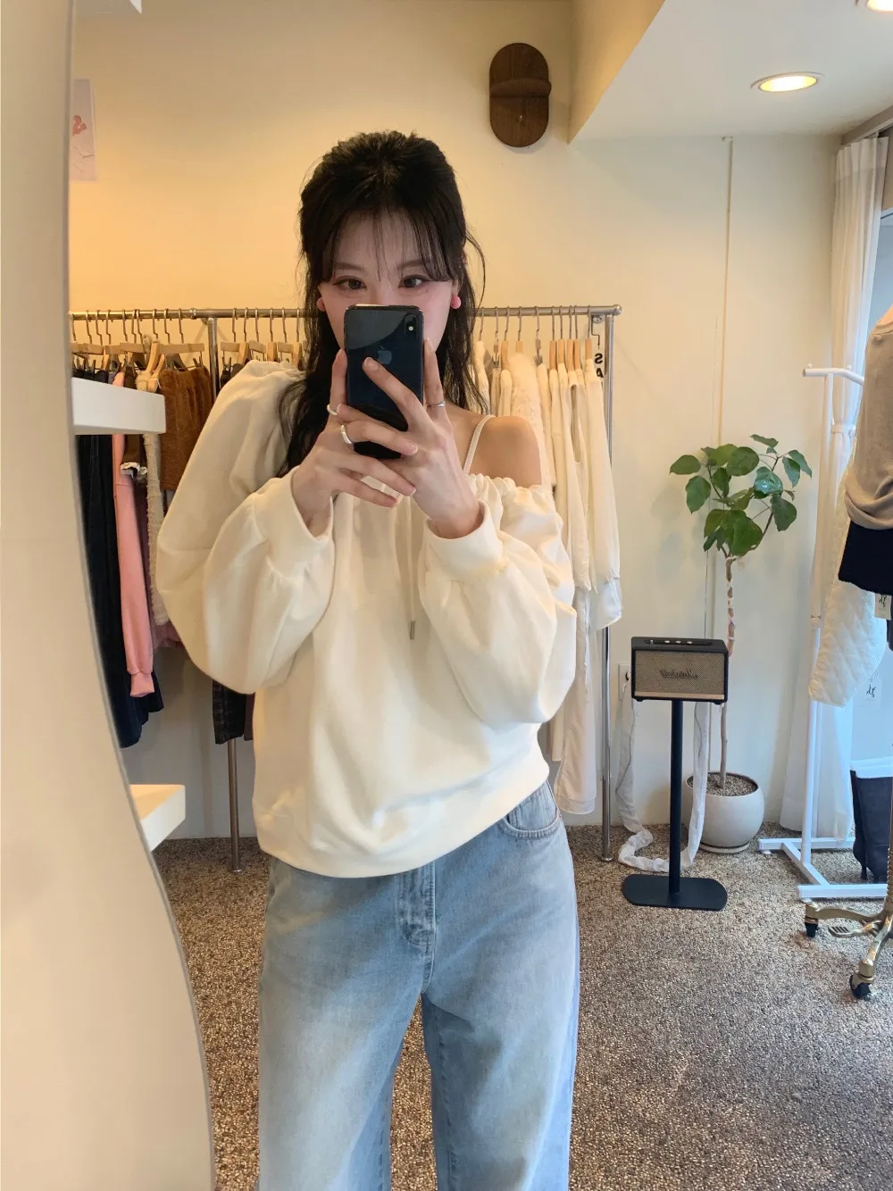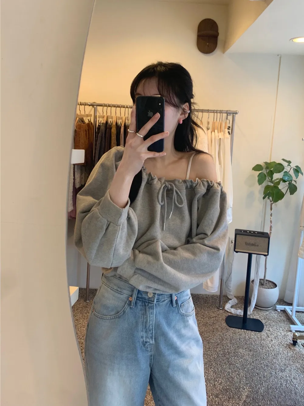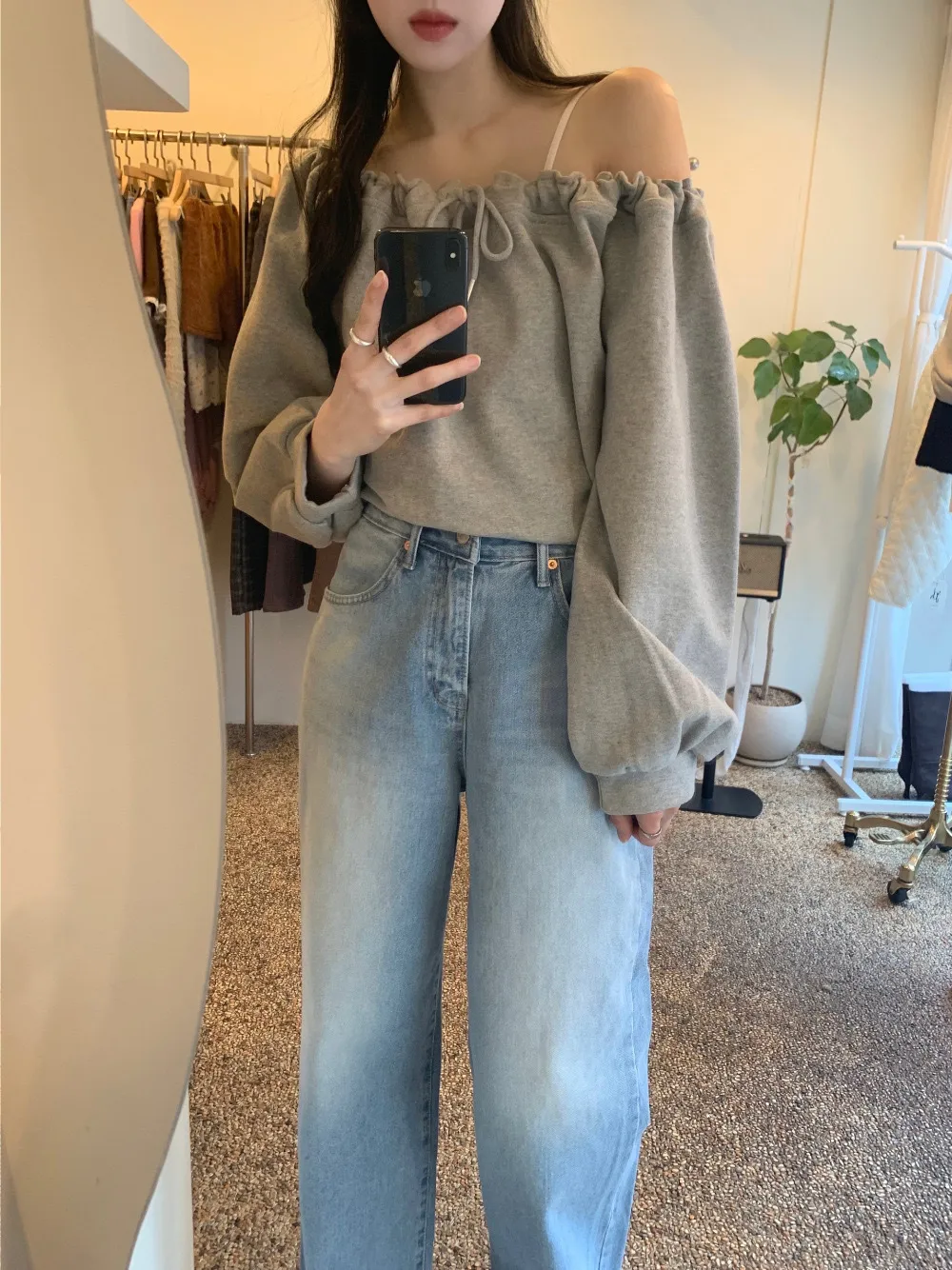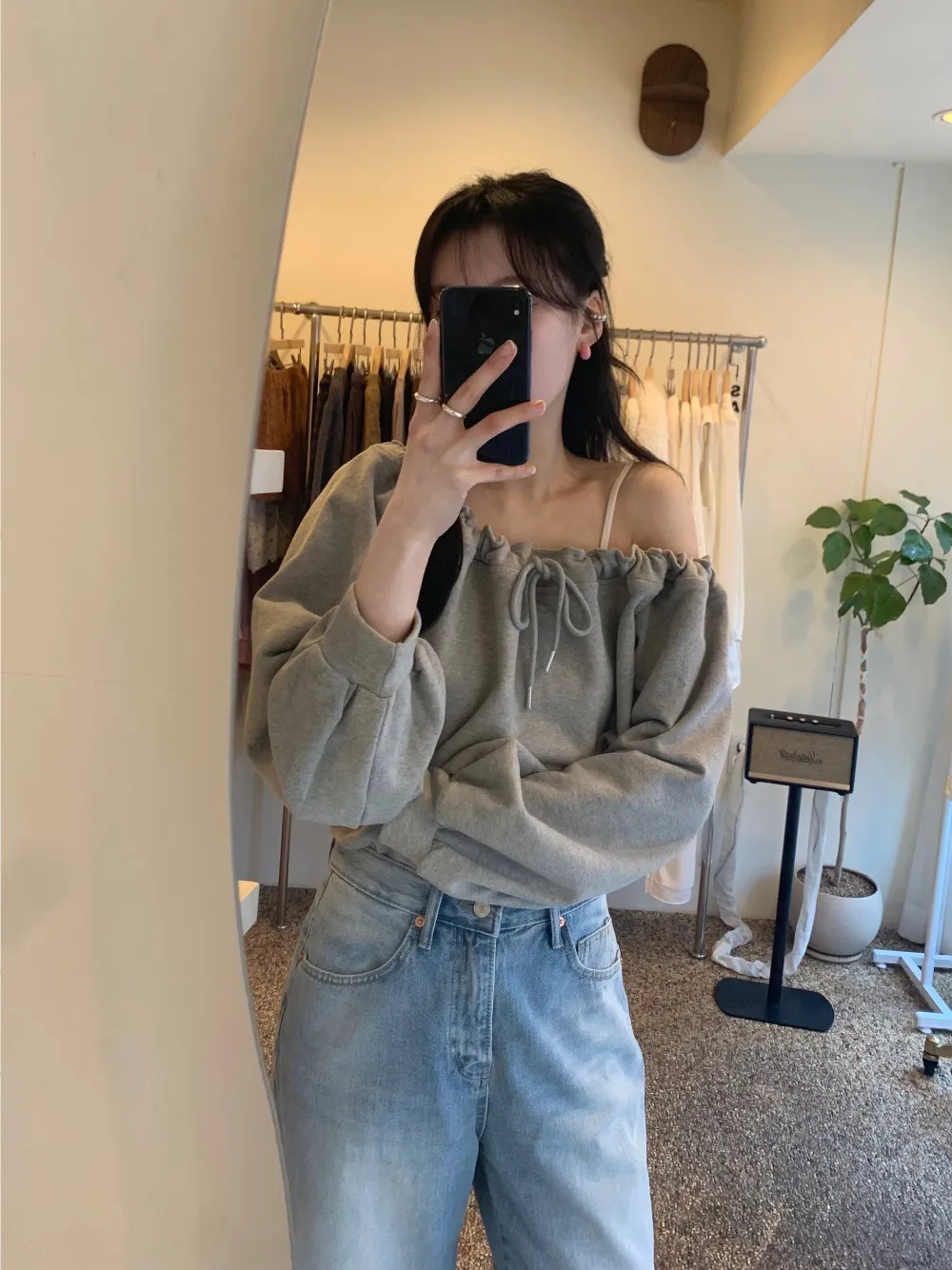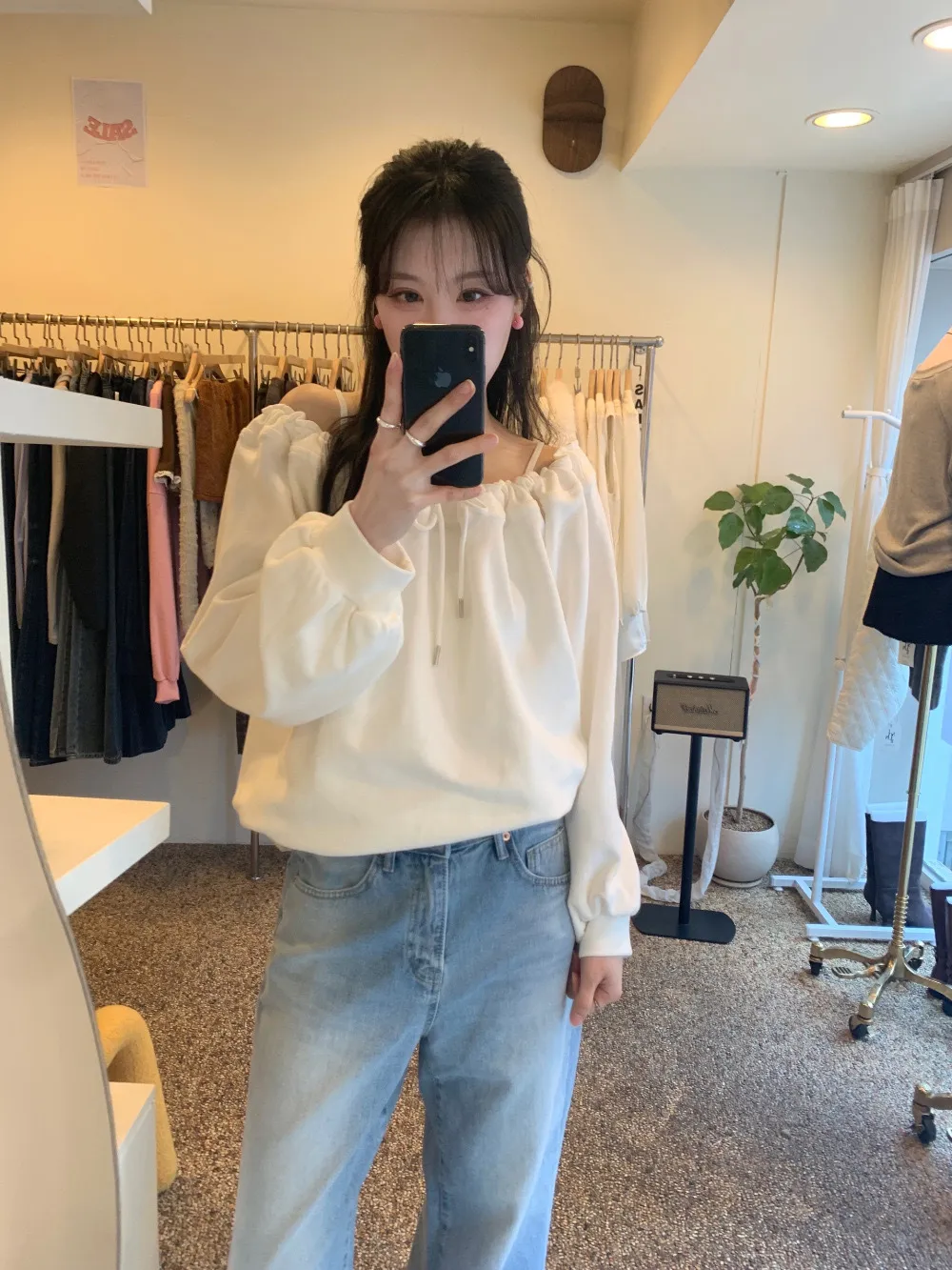 法式一字肩性感露肩抽繩簡約休閒顯瘦上衣