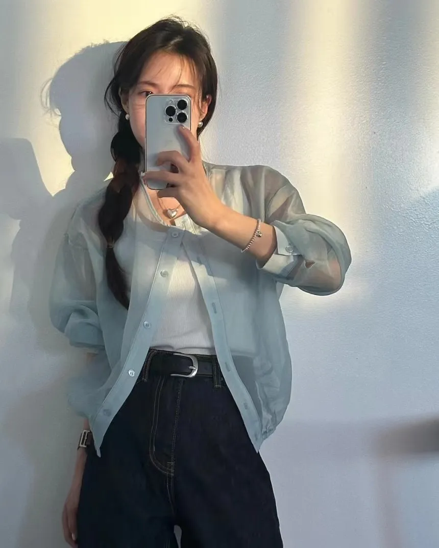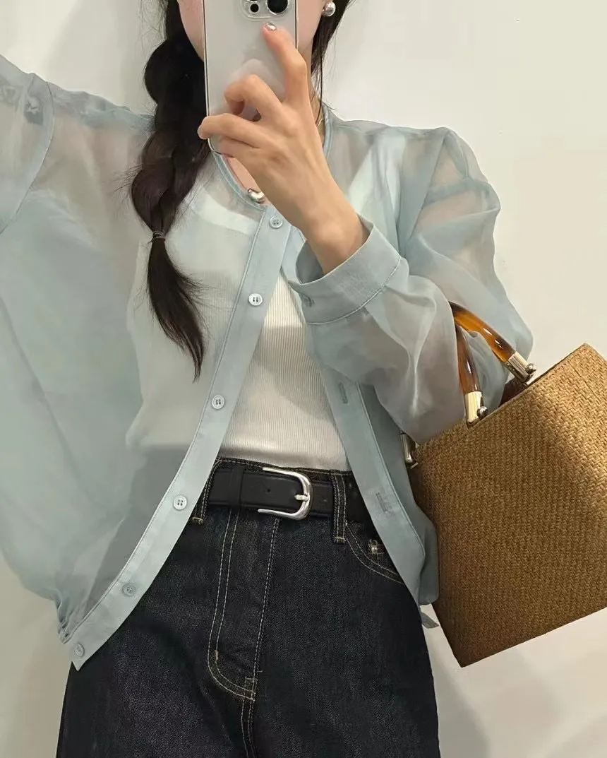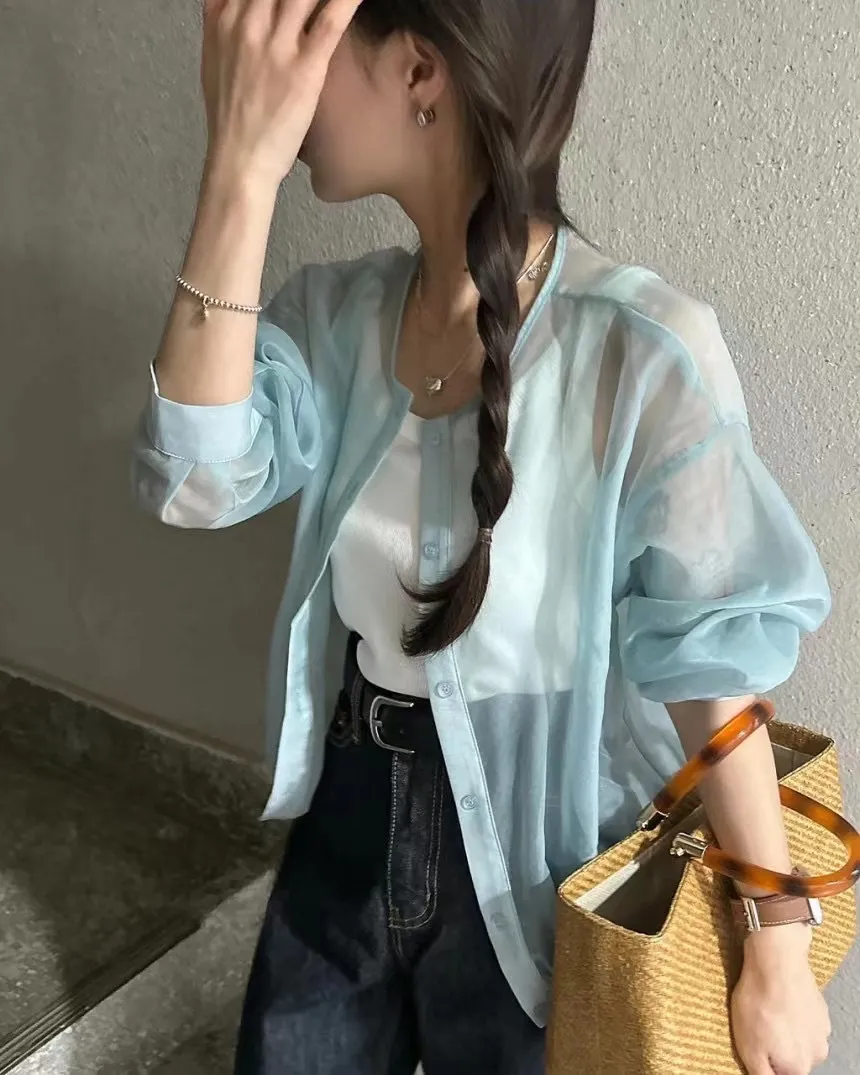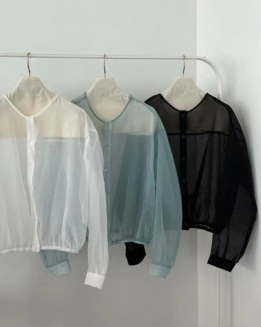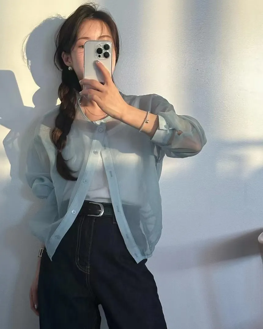 這款韓系微透簡約休閒感薄長袖襯衫是春夏衣櫃必備的百搭單品,