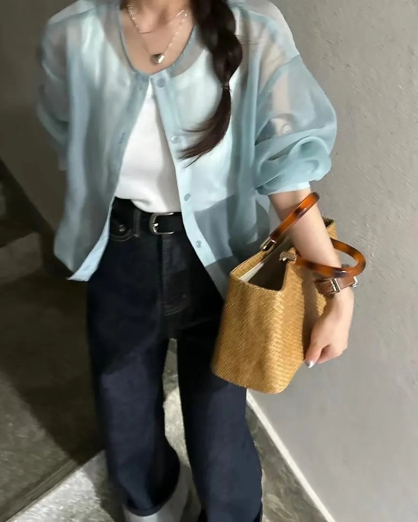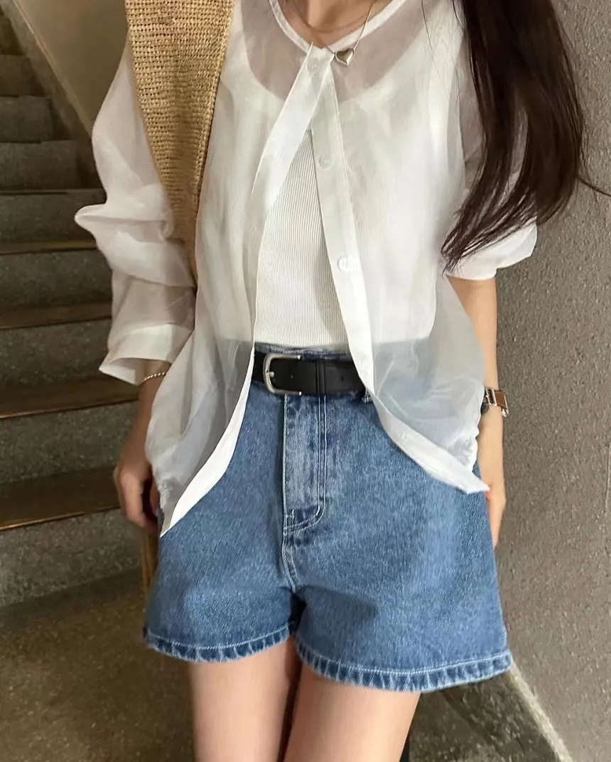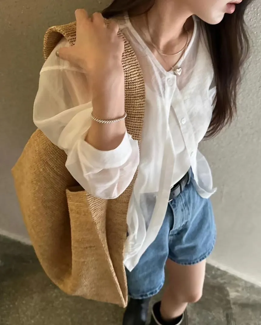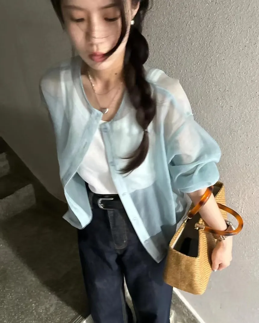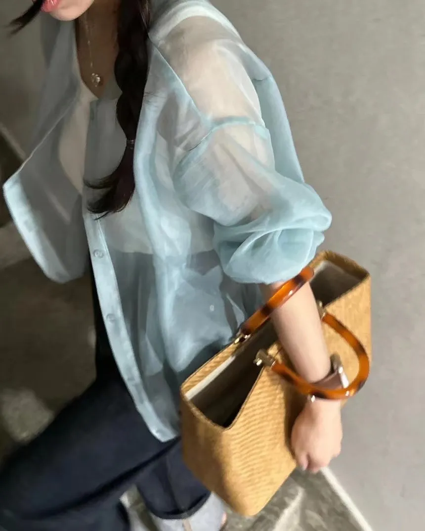 這款韓系微透簡約休閒感薄長袖襯衫是春夏衣櫃必備的百搭單品,