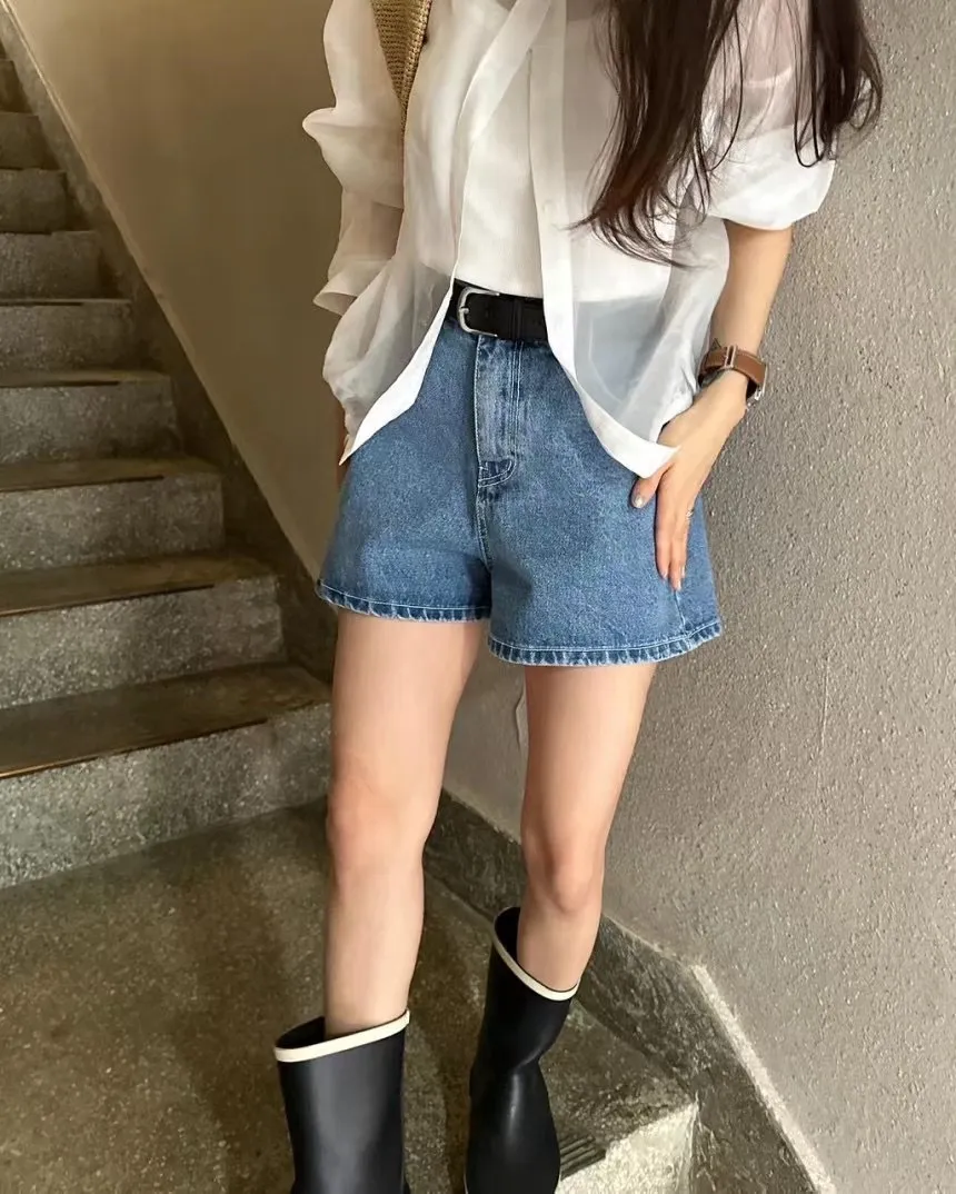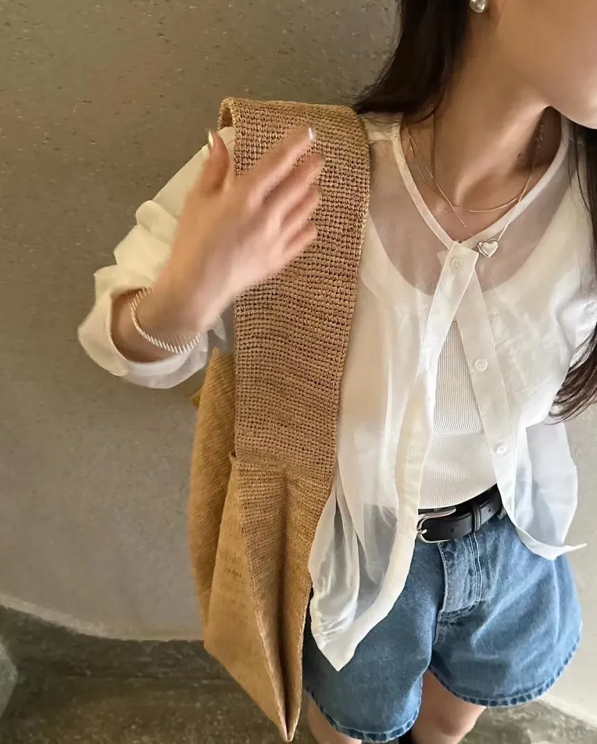 ✅ 搭配單品: 牛仔短褲 + 皮帶 + 編織包 + 休閒涼鞋