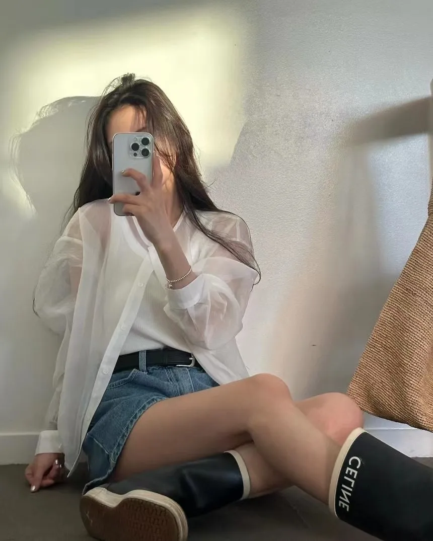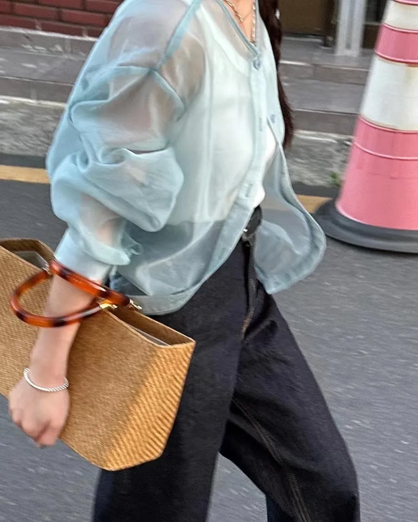 ✅ 風格特色: 透紗的輕盈感與牛仔布料的剛柔對比,打造時尚又不失休閒感的穿搭