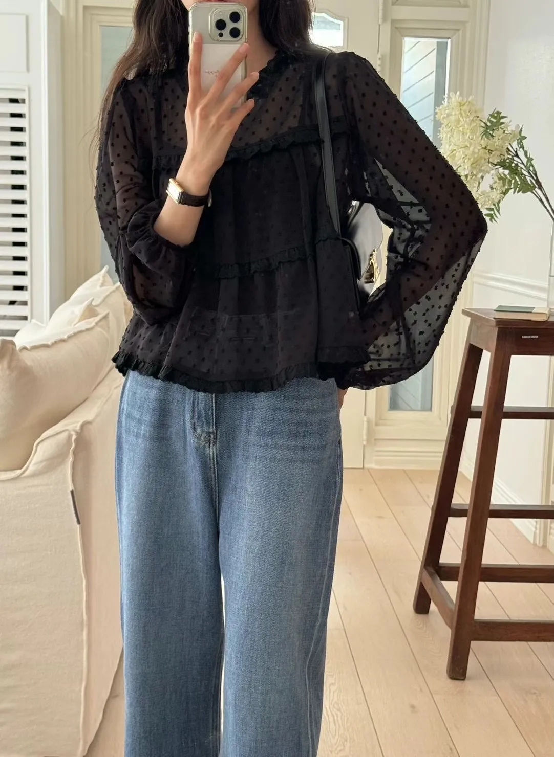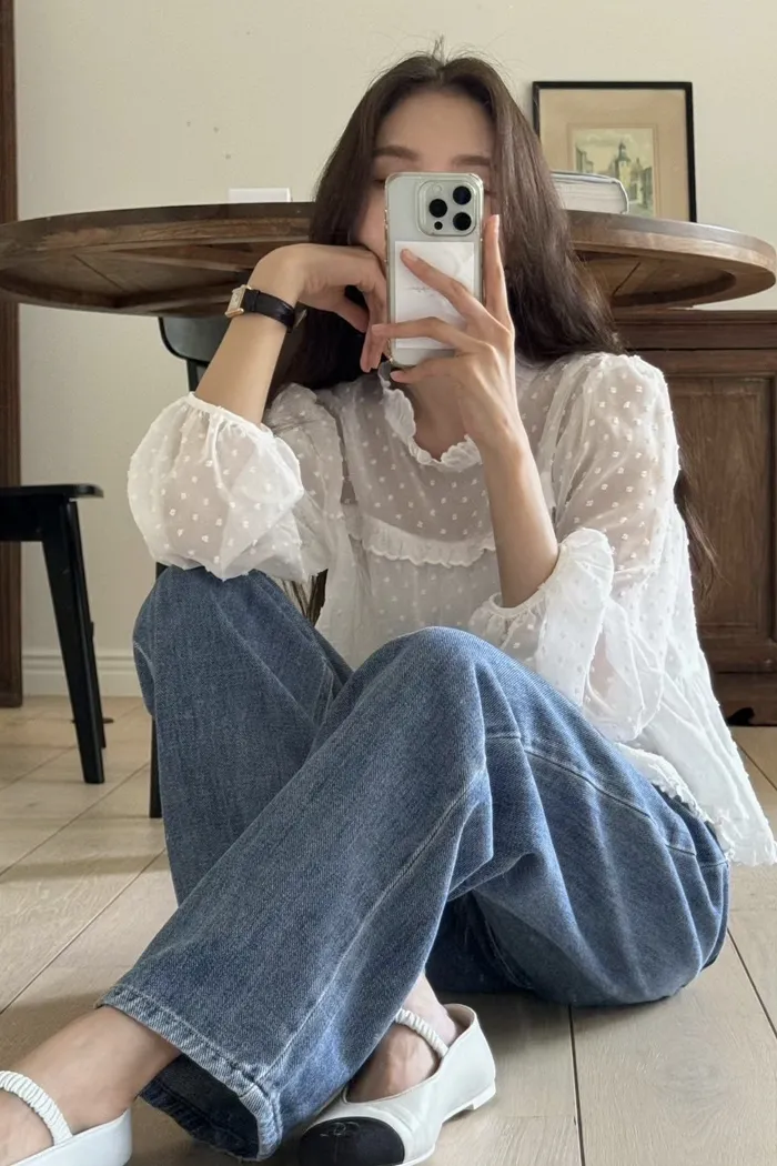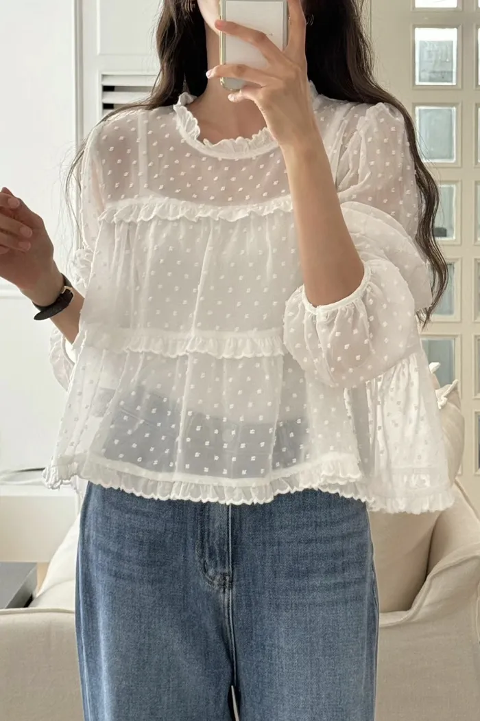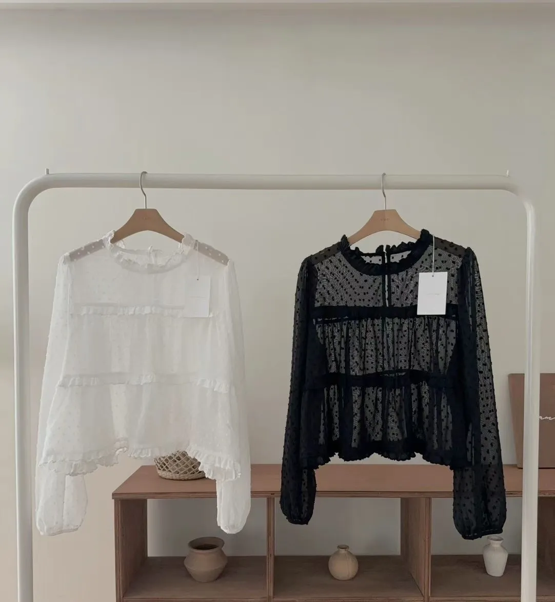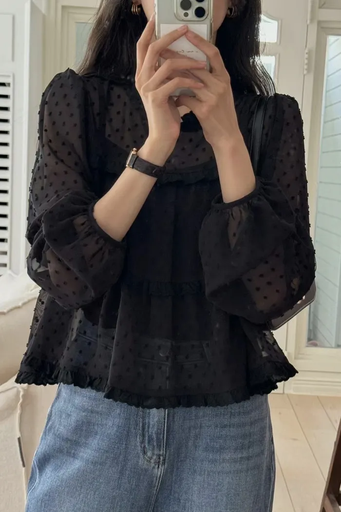 這款 法式夢幻波點紗袖襯衫 結合復古與現代感,