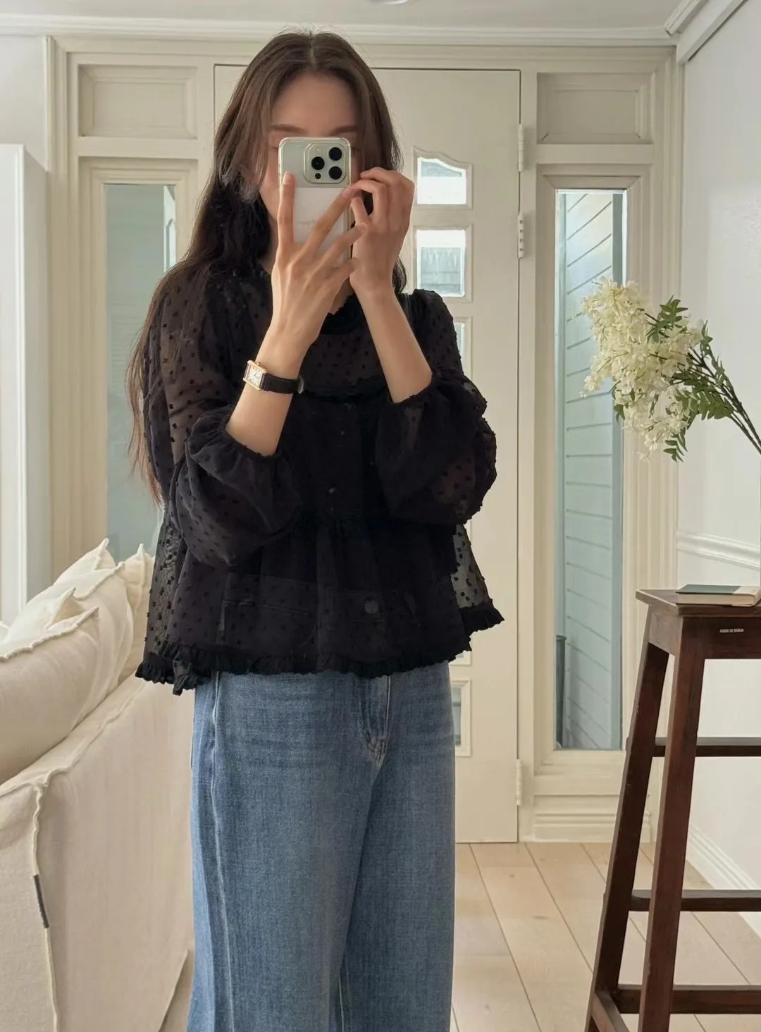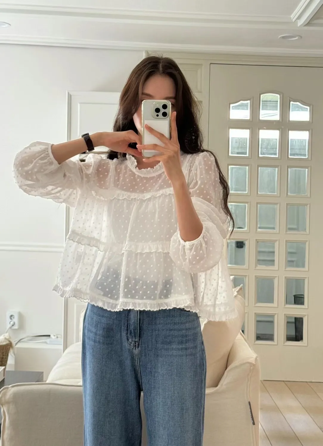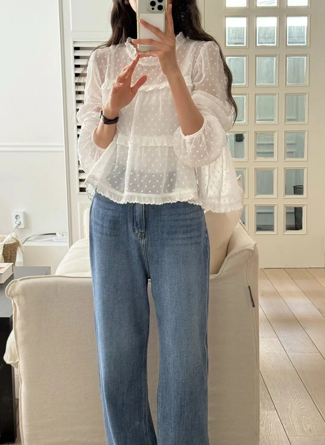 這款 法式夢幻波點紗袖襯衫 結合復古與現代感,